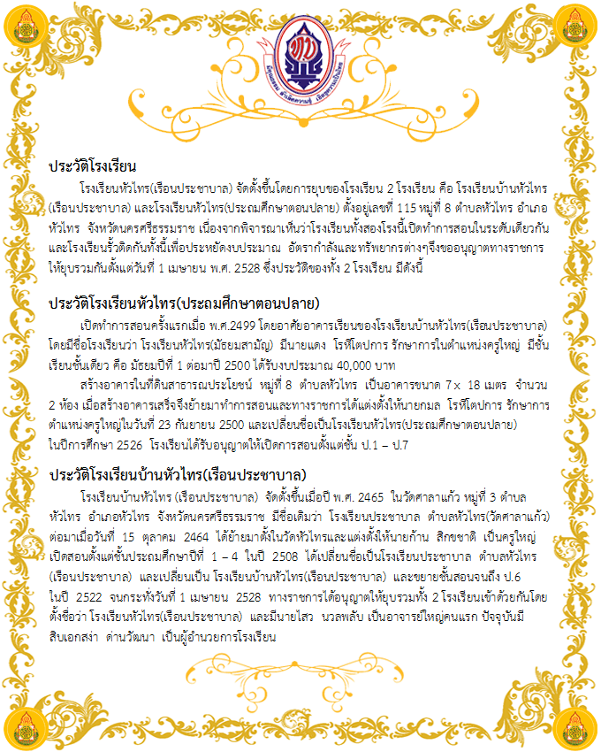 โรงเรียนหัวไทร(เรือนประชาบาล) สำนักงานเขตพื้นที่การศึกษาประถมศึกษานครศรีธรรมราช เขต 3 โทรศัพท์: 075389470 อีเมล์: huasaireun@hotmail.co.th