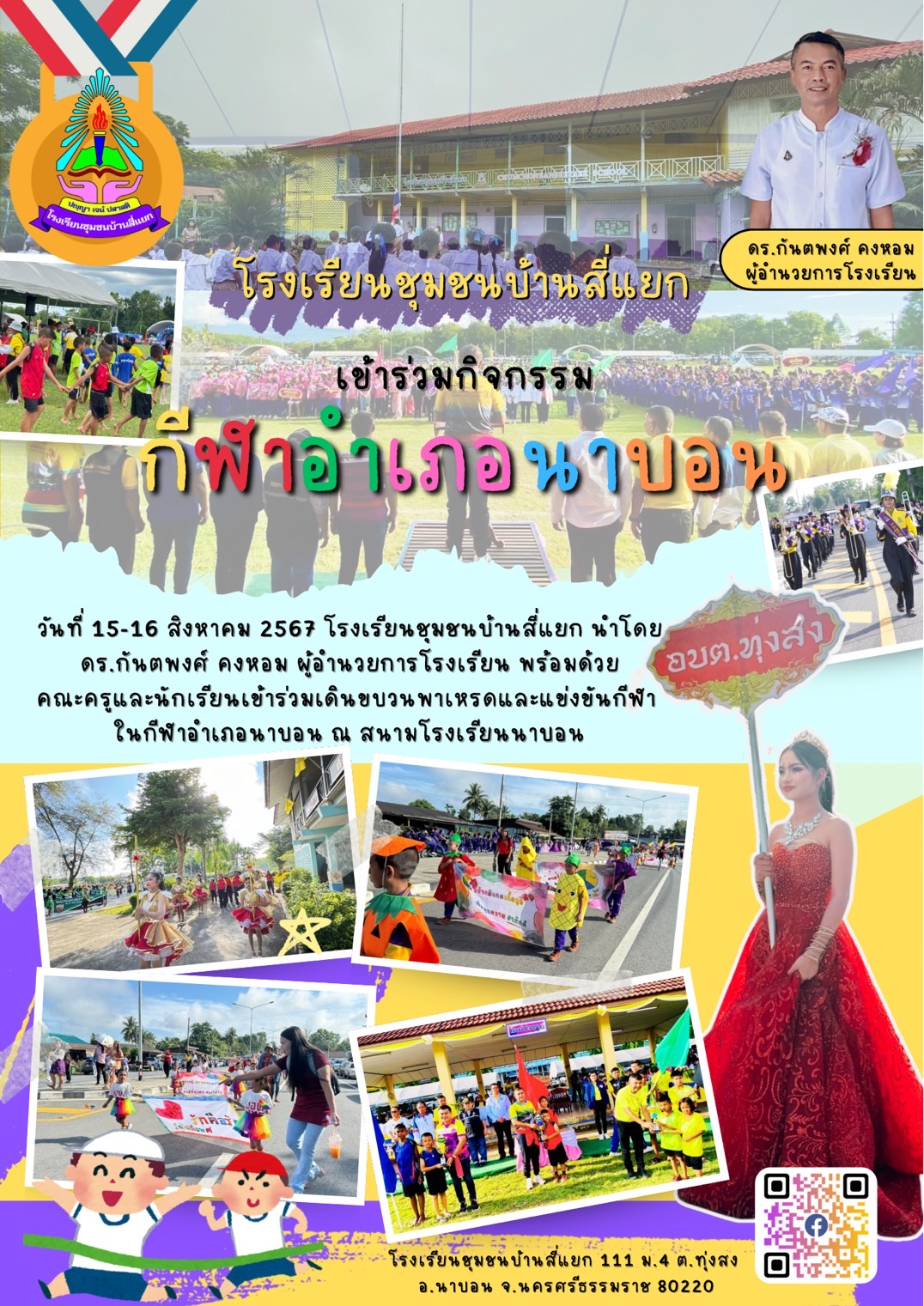 โรงเรียนชุมชนบ้านสี่แยกได้นำนักเรียนเข้าร่วมกิจกรรมการแข่งขันกีฬานักเรียน นักศึกษา และประชาชนอำเภอนาบอน นำโดยท่าน ดร.กันตพงศ์ คงหอม ได้นำวงโยธวาทิต ขบ |
