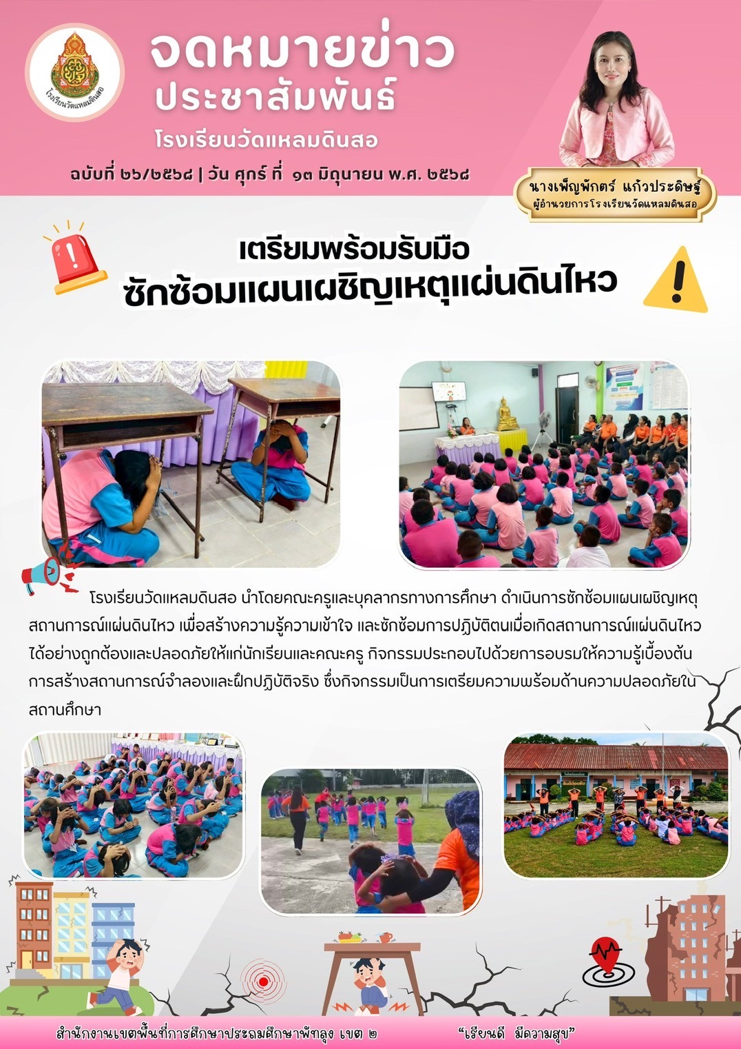 โรงเรียนวัดแหลมดินสอ นำโดยคณะครูและบุคลากรทางการศึกษา ดำเนินการซักซ้อมแผนเผชิญเหตุสถานการณ์แผ่นดินไหว เพื่อสร้างความรู้ความเข้าใจ และชักซ้อมการปฏิบัติตนเมื่อเกิดสถานการณ์แผ่นดินไหวได้อย่างถูกต้องและปลอดภัยให้แก่นักเรียนและคณะครู กิจกรรมประกอบไปด้วยการอบรมให้ความรู้เบื้องต้นการสร้างสถานการณ์จำลองและฝึกปฏิบัติจริง ซึ่งกิจกรรมเป็นการเตรียมความพร้อมด้านความปลอดภัยในสถานศึกษา