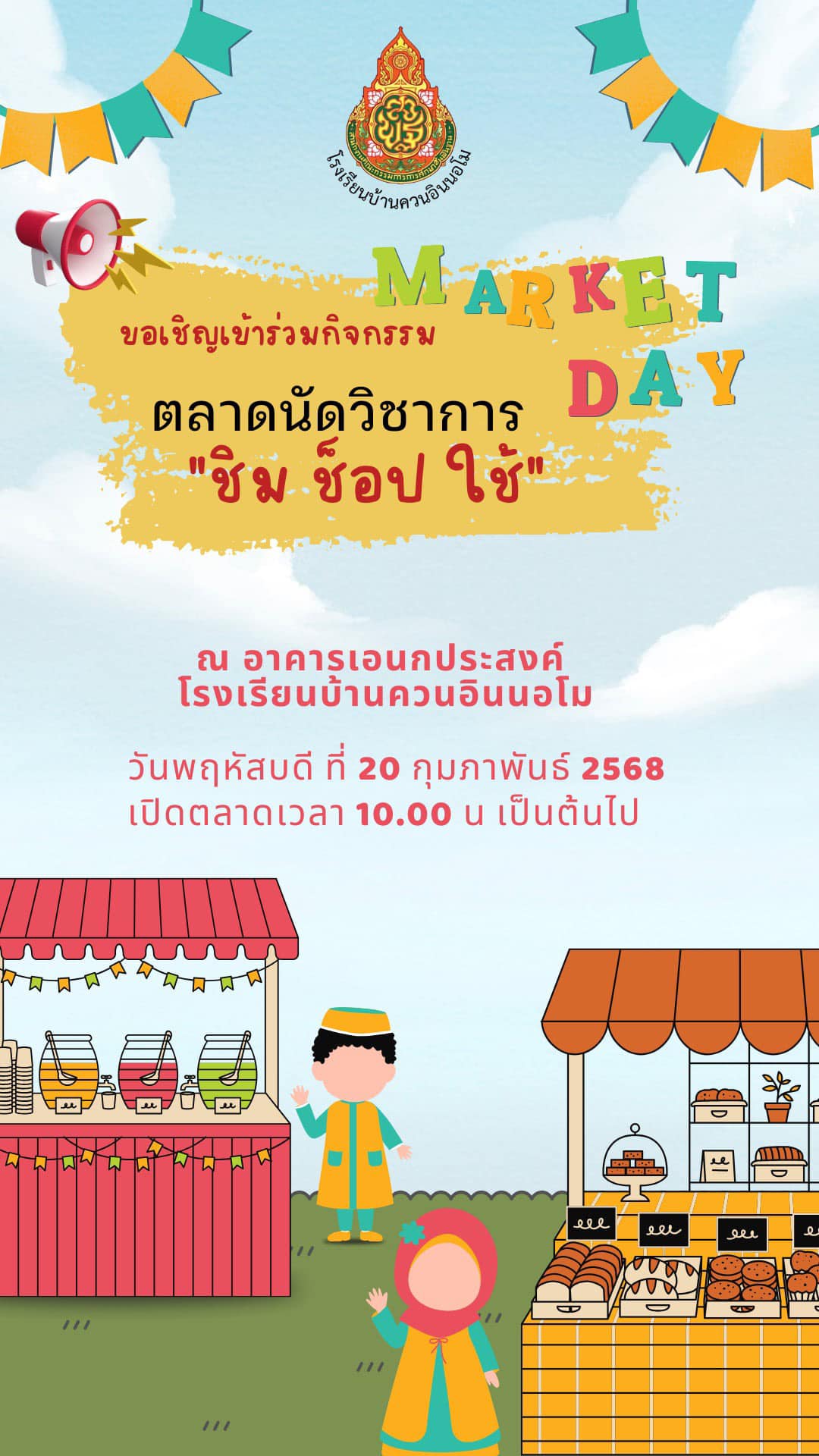 ขอเชิญเข้าร่วม เยี่ยมชมและจับจ่ายซื้อสินค้าจากนักเรียน ในกิจกรรมตลาดนัดวิชาการ "ชิม ช็อป ใช้" ณ อาคารเอนกประสงค์โรงเรียนบ้านควนอินนอโม