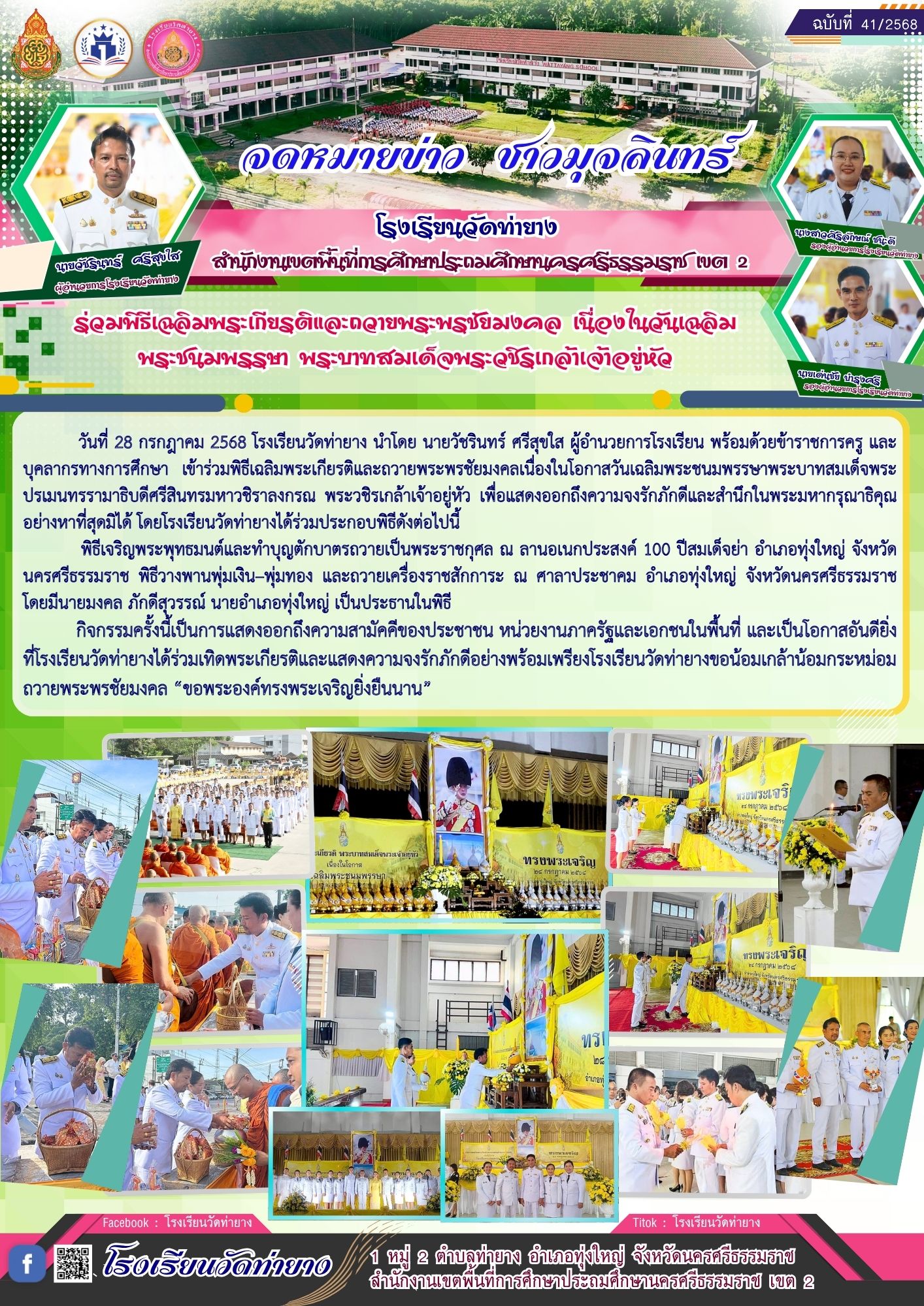 โรงเรียนวัดท่ายาง นำโดย นายวัชรินทร์ ศรีสุขใส ผู้อำนวยการโรงเรียน พร้อมด้วยข้าราชการครู และบุคลากรทางการศึกษา เข้าร่วม พิธีเฉลิมพระเกียรติและถวายพระพรชัยมงคล เนื่องในโอกาส วันเฉลิมพระชนมพรรษา พระบาทสมเด็จพระปรเมนทรรามาธิบดีศรีสินทรมหาวชิราลงกรณ พระวชิรเกล้าเจ้าอยู่หัว เพื่อแสดงออกถึงความจงรักภักดีและสำนึกในพระมหากรุณาธิคุณอย่างหาที่สุดมิได้