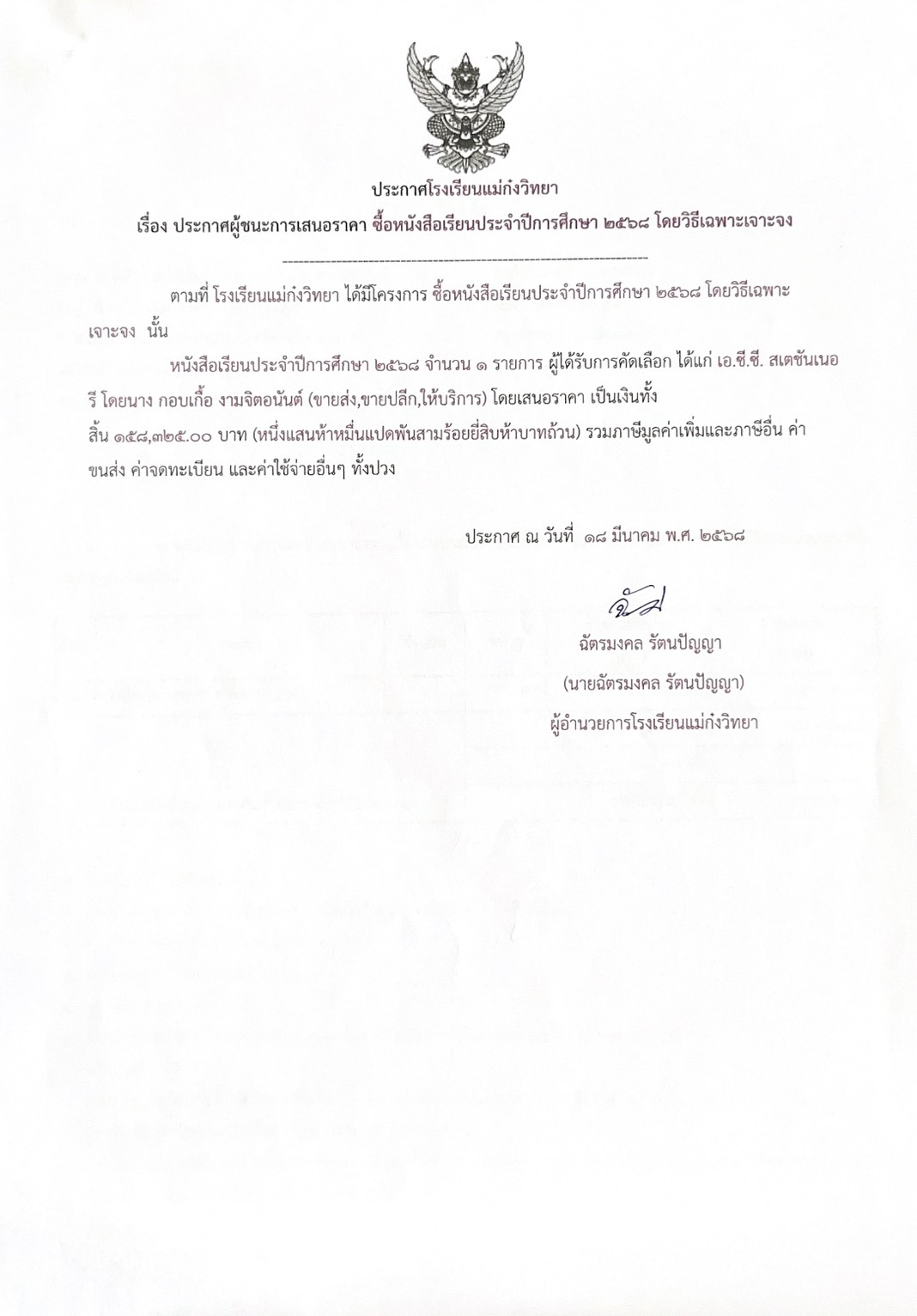 ประกาศผู้ชนะการเสนอราคาจัดซื้อหนังสือเรียน ปีการศึกษา ๒๕๖๘ ตามนโยบายเรียนฟรี ๑๕ ปีอย่างมีคุณภาพ โดยวิธีเฉพาะเจาะจง