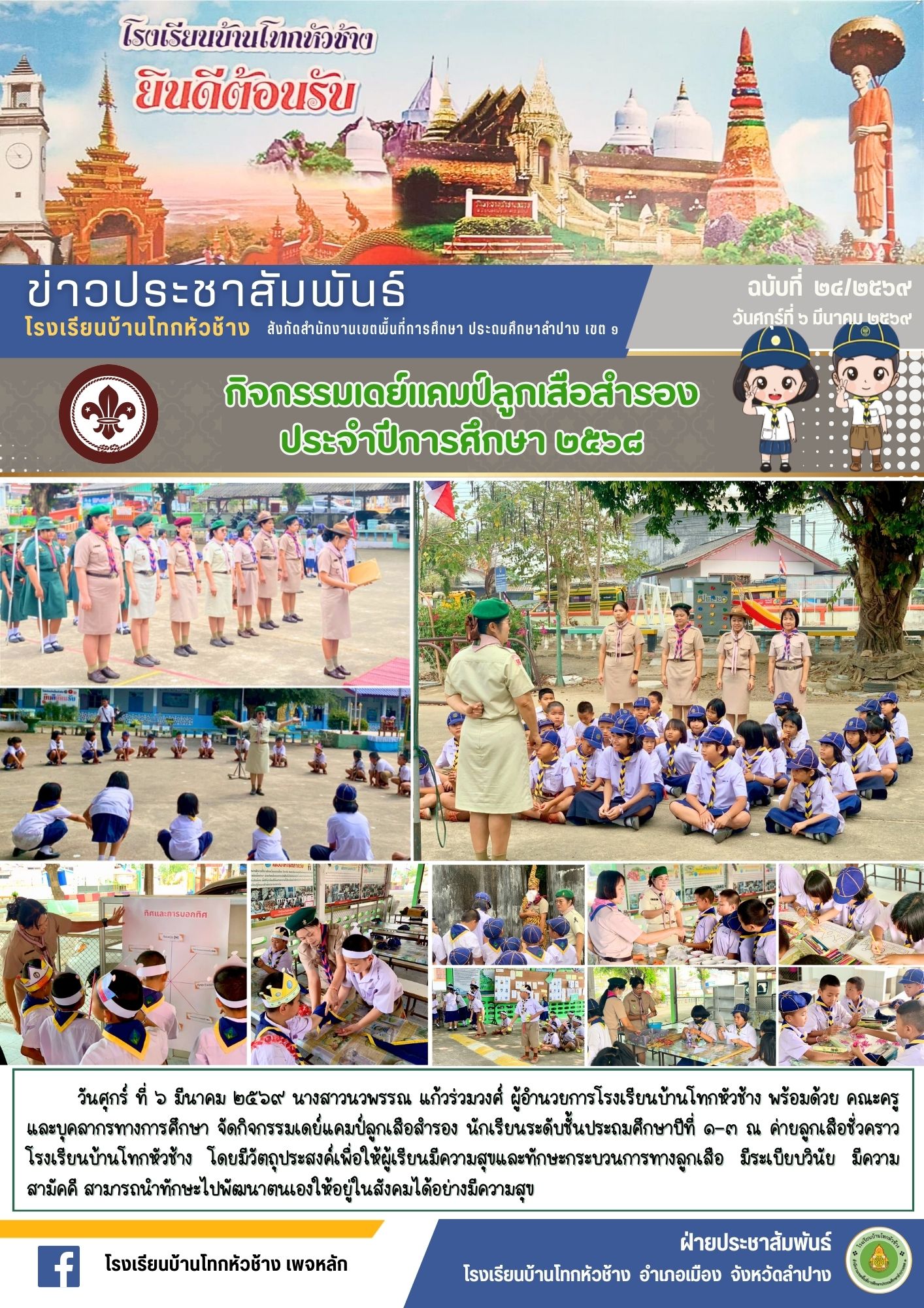 วันศุกร์ ที่ ๖ มีนาคม ๒๕๖๙ นางสาวนวพรรณ แก้วร่วมวงศ์ ผู้อำนวยการโรงเรียนบ้านโทกหัวช้าง พร้อมด้วย คณะครูและบุคลากรทางการศึกษา จัดกิจกรรมเดย์แคมป์ลูกเสือสำรอง นักเรียนระดับชั้นประถมศึกษาปีที่ ๑-๓ ณ ค่ายลูกเสือชั่วคราวโรงเรียนบ้านโทกหัวช้าง โดยมีวัตถุประสงค์เพื่อให้ผู้เรียนมีความสุขและทักษะกระบวนการทางลูกเสือ มีระเบียบวินัย มีความสามัคคี สามารถนำทักษะไปพัฒนาตนเองให้อยู่ในสังคมได้อย่างมีความสุข