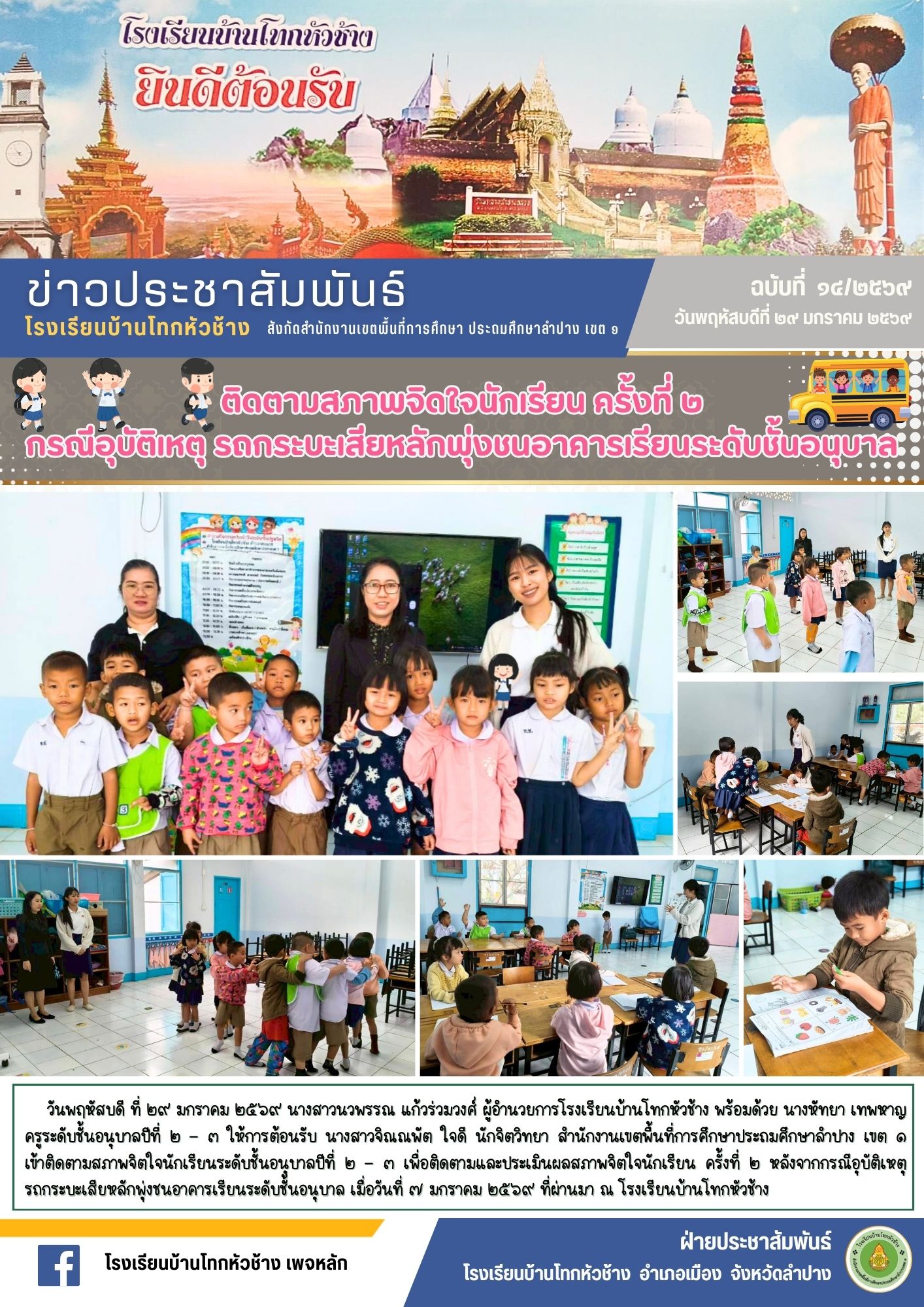 วันศุกร์ ที่ ๖ มีนาคม ๒๕๖๙ นางสาวนวพรรณ แก้วร่วมวงศ์ ผู้อำนวยการโรงเรียนบ้านโทกหัวช้าง พร้อมด้วย คณะครูและบุคลากรทางการศึกษา จัดกิจกรรมลูกเสือ-เนตรนารี และกิจกรรมศึกษาแหล่งเรียนรู้ (ประวัติศาสตร์) นักเรียนระดับชั้นประถมศึกษาปีที่ ๔-๖ ณ บ้านป่องนัก ตำบลพิชัย อำเภอเมืองลำปาง จังหวัดลำปาง โดยมีวัตถุประสงค์เพื่อให้นักเรียนได้รับความรู้และประสบการณ์จากแหล่งเรียนรู้นอกห้องเรียน เพื่อสร้างความเป็นระเบียบวินัย ความเป็นผู้นำและความอดทน สามารถนำมาปรับใช้ในชีวิตประจำวันและอยู่ร่วมในสังคมได้อย่างมีความสุข