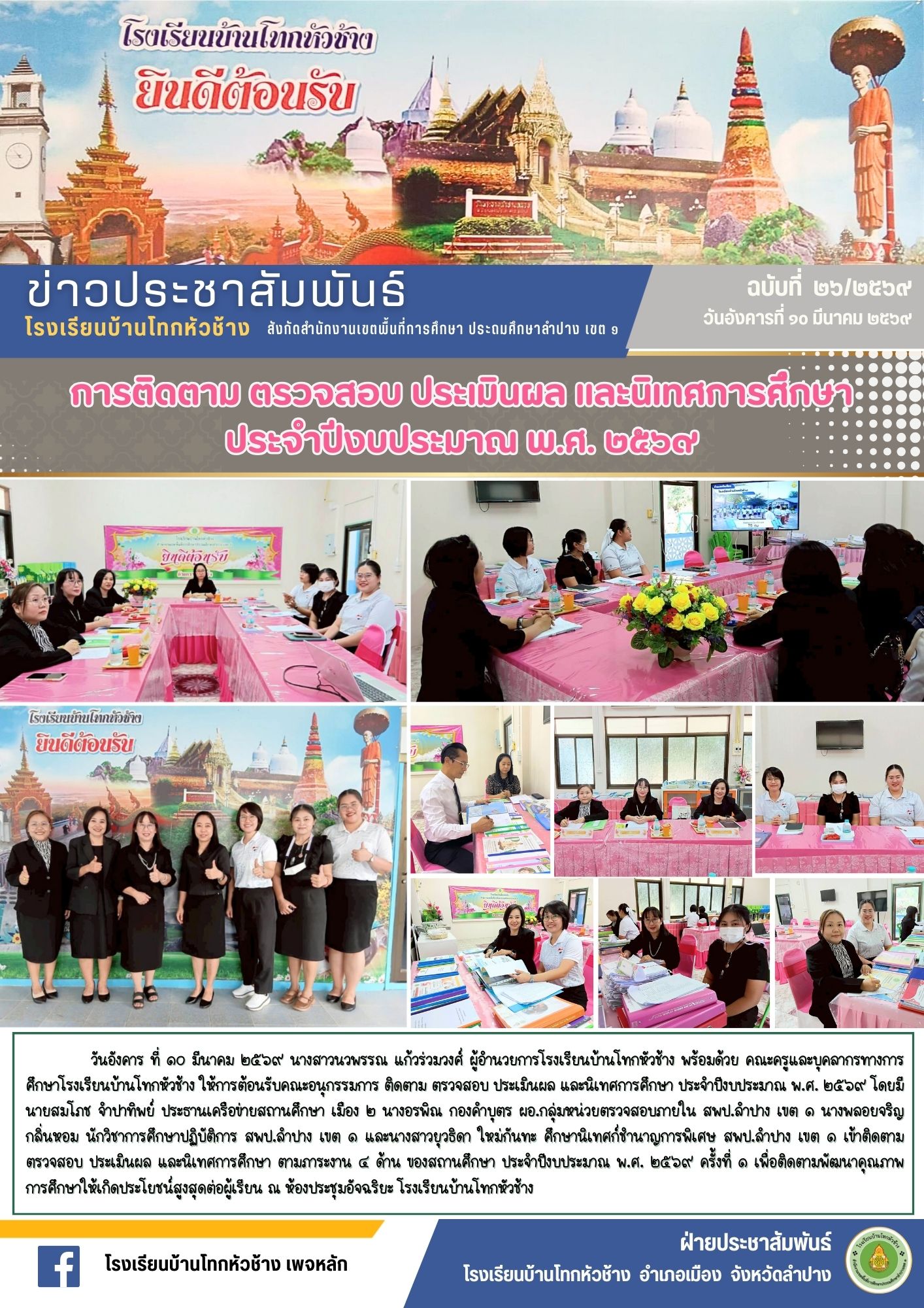 วันอังคาร ที่ ๑๐ มีนาคม ๒๕๖๙ นางสาวนวพรรณ แก้วร่วมวงศ์ ผู้อำนวยการโรงเรียนบ้านโทกหัวช้าง พร้อมด้วย คณะครูและบุคลากรทางการศึกษาโรงเรียนบ้านโทกหัวช้าง ให้การต้อนรับคณะอนุกรรมการ ติดตาม ตรวจสอบ ประเมินผล และนิเทศการศึกษา ประจำปีงบประมาณ พ.ศ. ๒๕๖๙ โดยมี นายสมโภช จำปาทิพย์ ประธานเครือข่ายสถานศึกษา เมือง ๒ นางอรพิณ กองคำบุตร ผอ.กลุ่มหน่วยตรวจสอบภายใน สพป.ลำปาง เขต ๑ นางพลอยจริญ กลิ่นหอม นักวิชาการศึกษาปฏิบัติการ สพป.ลำปาง เขต ๑ และนางสาวยุวธิดา ใหม่กันทะ ศึกษานิเทศก์ชำนาญการพิเศษ สพป.ลำปาง เขต ๑ เข้าติดตาม ตรวจสอบ ประเมินผล และนิเทศการศึกษา ตามภาระงาน ๔ ด้าน ของสถานศึกษา ประจำปีงบประมาณ พ.ศ. ๒๕๖๙ ครั้งที่ ๑ เพื่อติดตามพัฒนาคุณภาพการศึกษาให้เกิดประโยชน์สูงสุดต่อผู้เรียน ณ ห้องประชุมอัจฉริยะ โรงเรียนบ้านโทกหัวช้าง