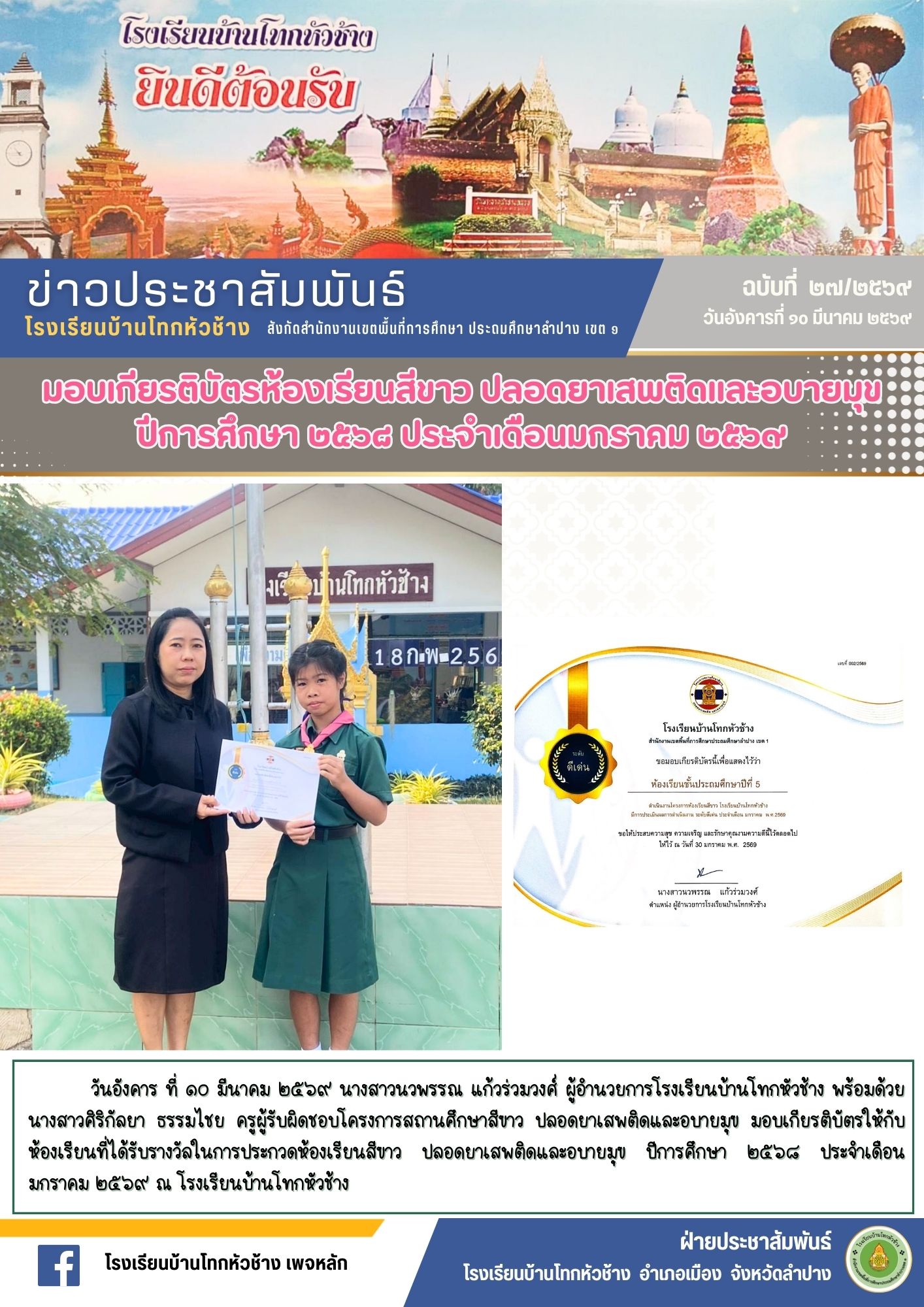 วันอังคาร ที่ ๑๐ มีนาคม ๒๕๖๙ นางสาวนวพรรณ แก้วร่วมวงศ์ ผู้อำนวยการโรงเรียนบ้านโทกหัวช้าง พร้อมด้วย นางสาวศิริกัลยา ธรรมไชย ครูผู้รับผิดชอบโครงการสถานศึกษาสีขาว ปลอดยาเสพติดและอบายมุข มอบเกียรติบัตรให้กับห้องเรียนที่ได้รับรางวัลในการประกวดห้องเรียนสีขาว ปลอดยาเสพติดและอบายมุข ปีการศึกษา ๒๕๖๘ ประจำเดือนมกราคม ๒๕๖๙ ณ โรงเรียนบ้านโทกหัวช้าง