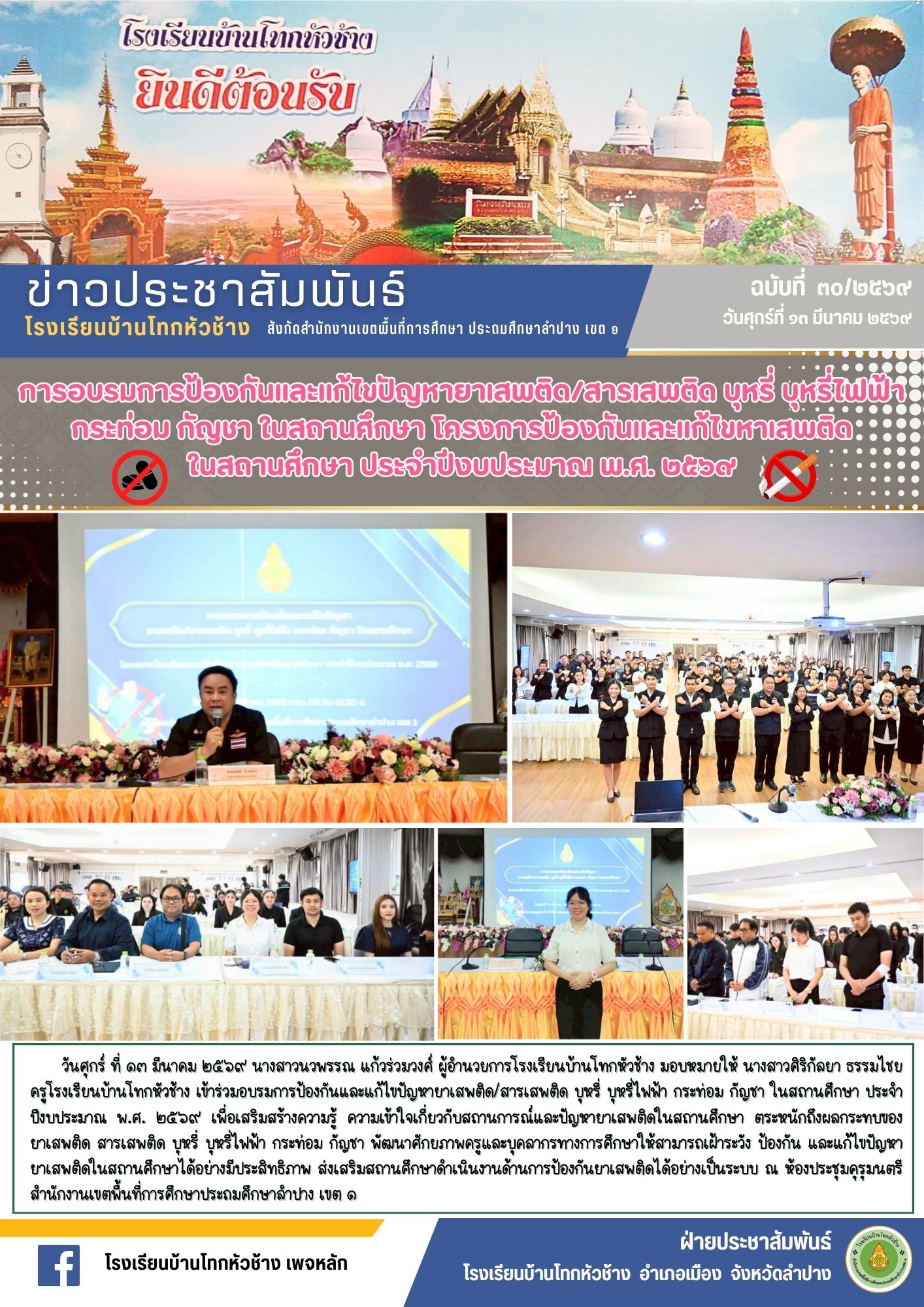 วันศุกร์ ที่ ๑๓ มีนาคม ๒๕๖๙ นางสาวนวพรรณ แก้วร่วมวงศ์ ผู้อำนวยการโรงเรียนบ้านโทกหัวช้าง มอบหมายให้ นางสาวศิริกัลยา ธรรมไชย ครูโรงเรียนบ้านโทกหัวช้าง เข้าร่วมอบรมการป้องกันและแก้ไขปัญหายาเสพติด/สารเสพติด บุหรี่ บุหรี่ไฟฟ้า กระท่อม กัญชา ในสถานศึกษา ประจำปีงบประมาณ พ.ศ. ๒๕๖๙ เพื่อเสริมสร้างความรู้ ความเข้าใจเกี่ยวกับสถานการณ์และปัญหายาเสพติดในสถานศึกษา ตระหนักถึงผลกระทบของ ยาเสพติด สารเสพติด บุหรี่ บุหรี่ไฟฟ้า กระท่อม กัญชา พัฒนาศักยภาพครูและบุคลากรทางการศึกษาให้สามารถเฝ้าระวัง ป้องกัน และแก้ไขปัญหายาเสพติดในสถานศึกษาได้อย่างมีประสิทธิภาพ ส่งเสริมสถานศึกษาดำเนินงานด้านการป้องกันยาเสพติดได้อย่างเป็นระบบ ณ ห้องประชุมคุรุมนตรี สำนักงานเขตพื้นที่การศึกษาประถมศึกษาลำปาง เขต ๑