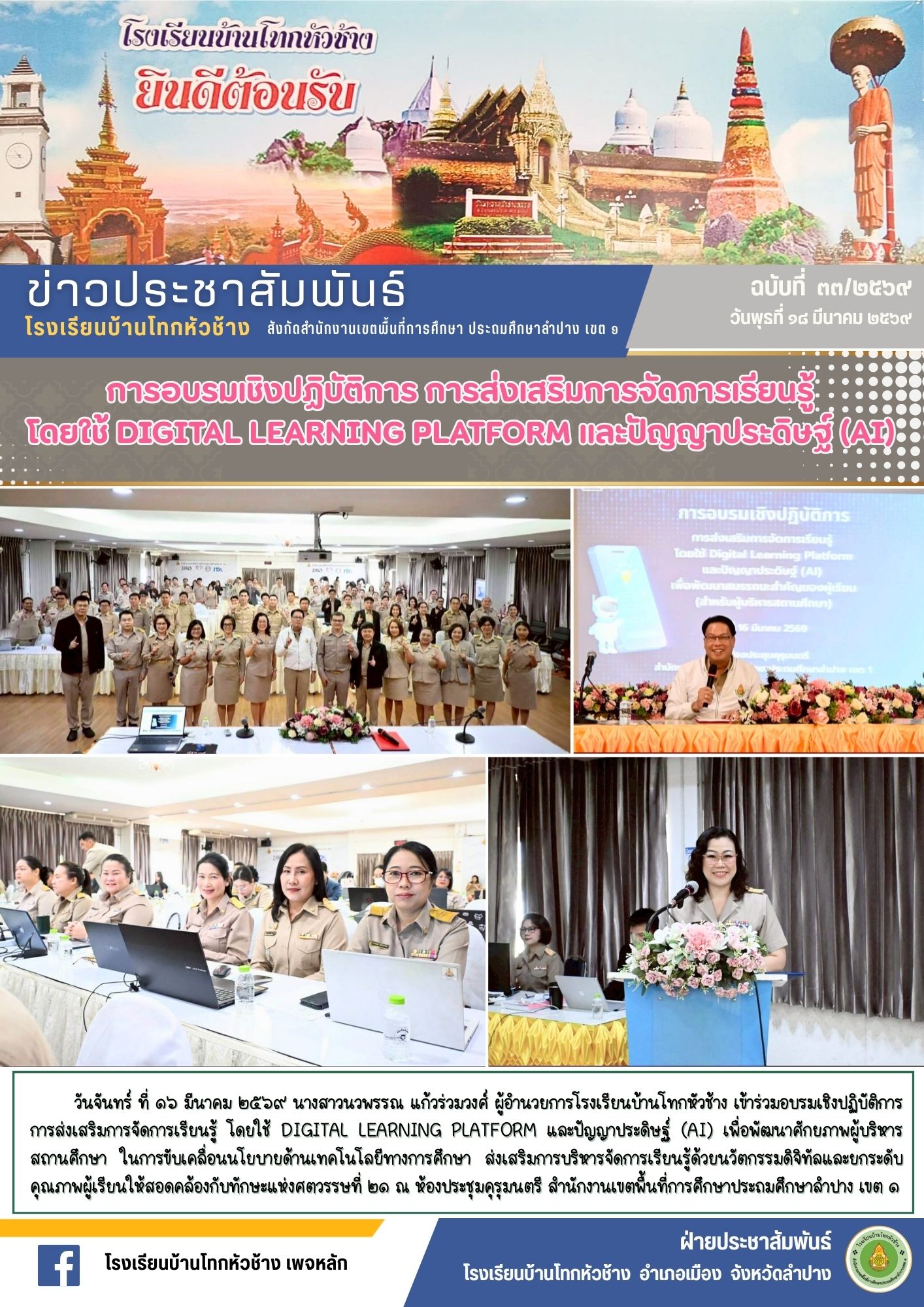 วันจันทร์ ที่ ๑๖ มีนาคม ๒๕๖๙ นางสาวนวพรรณ แก้วร่วมวงศ์ ผู้อำนวยการโรงเรียนบ้านโทกหัวช้าง เข้าร่วมอบรมเชิงปฏิบัติการ การส่งเสริมการจัดการเรียนรู้ โดยใช้ DIGITAL LEARNING PLATFORM และปัญญาประดิษฐ์ (AI) เพื่อพัฒนาศักยภาพผู้บริหารสถานศึกษา ในการขับเคลื่อนนโยบายด้านเทคโนโลยีทางการศึกษา ส่งเสริมการบริหารจัดการเรียนรู้ด้วยนวัตกรรมดิจิทัลและยกระดับคุณภาพผู้เรียนให้สอดคล้องกับทักษะแห่งศตวรรษที่ ๒๑ ณ ห้องประชุมคุรุมนตรี สำนักงานเขตพื้นที่การศึกษาประถมศึกษาลำปาง เขต ๑