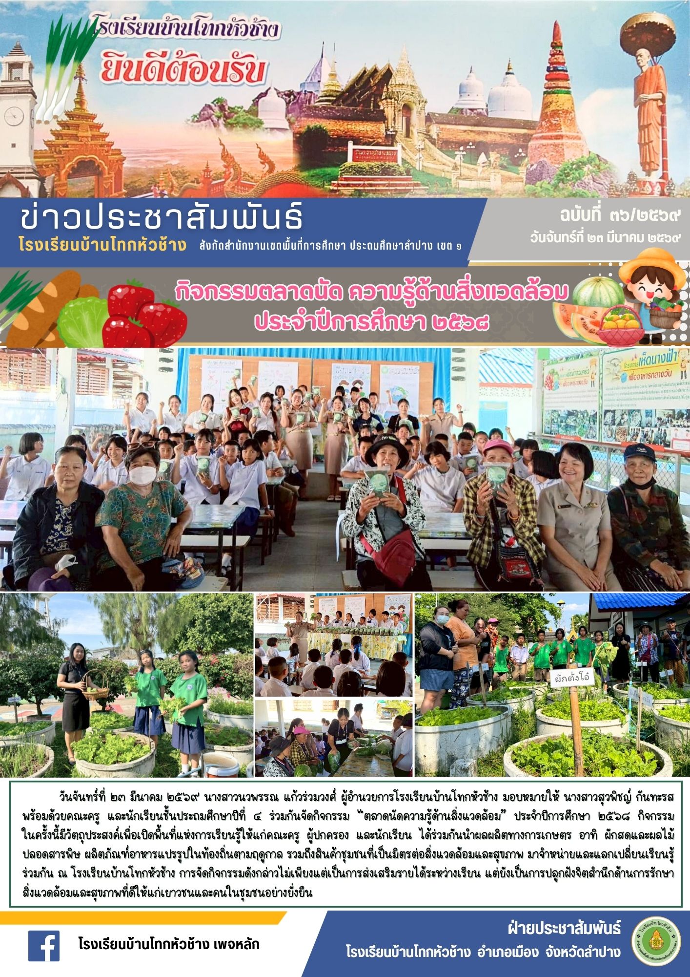 วันจันทร์ที่ ๒๓ มีนาคม ๒๕๖๙ นางสาวนวพรรณ แก้วร่วมวงศ์ ผู้อำนวยการโรงเรียนบ้านโทกหัวช้าง มอบหมายให้ นางสาวสุวพิชญ์ กันทะรส พร้อมด้วยคณะครู และนักเรียนชั้นประถมศึกษาปีที่ ๔ ร่วมกันจัดกิจกรรม “ตลาดนัดความรู้ด้านสิ่งแวดล้อม” ประจำปีการศึกษา ๒๕๖๘ กิจกรรม ในครั้งนี้มีวัตถุประสงค์เพื่อเปิดพื้นที่แห่งการเรียนรู้ให้แก่คณะครู ผู้ปกครอง และนักเรียน ได้ร่วมกันนำผลผลิตทางการเกษตร อาทิ ผักสดและผลไม้ปลอดสารพิษ ผลิตภัณฑ์อาหารแปรรูปในท้องถิ่นตามฤดูกาล รวมถึงสินค้าชุมชนที่เป็นมิตรต่อสิ่งแวดล้อมและสุขภาพ มาจำหน่ายและแลกเปลี่ยนเรียนรู้ร่วมกัน ณ โรงเรียนบ้านโทกหัวช้าง การจัดกิจกรรมดังกล่าวไม่เพียงแต่เป็นการส่งเสริมรายได้ระหว่างเรียน แต่ยังเป็นการปลูกฝังจิตสำนึกด้านการรักษาสิ่งแวดล้อมและสุขภาพที่ดีให้แก่เยาวชนและคนในชุมชนอย่างยั่งยืน