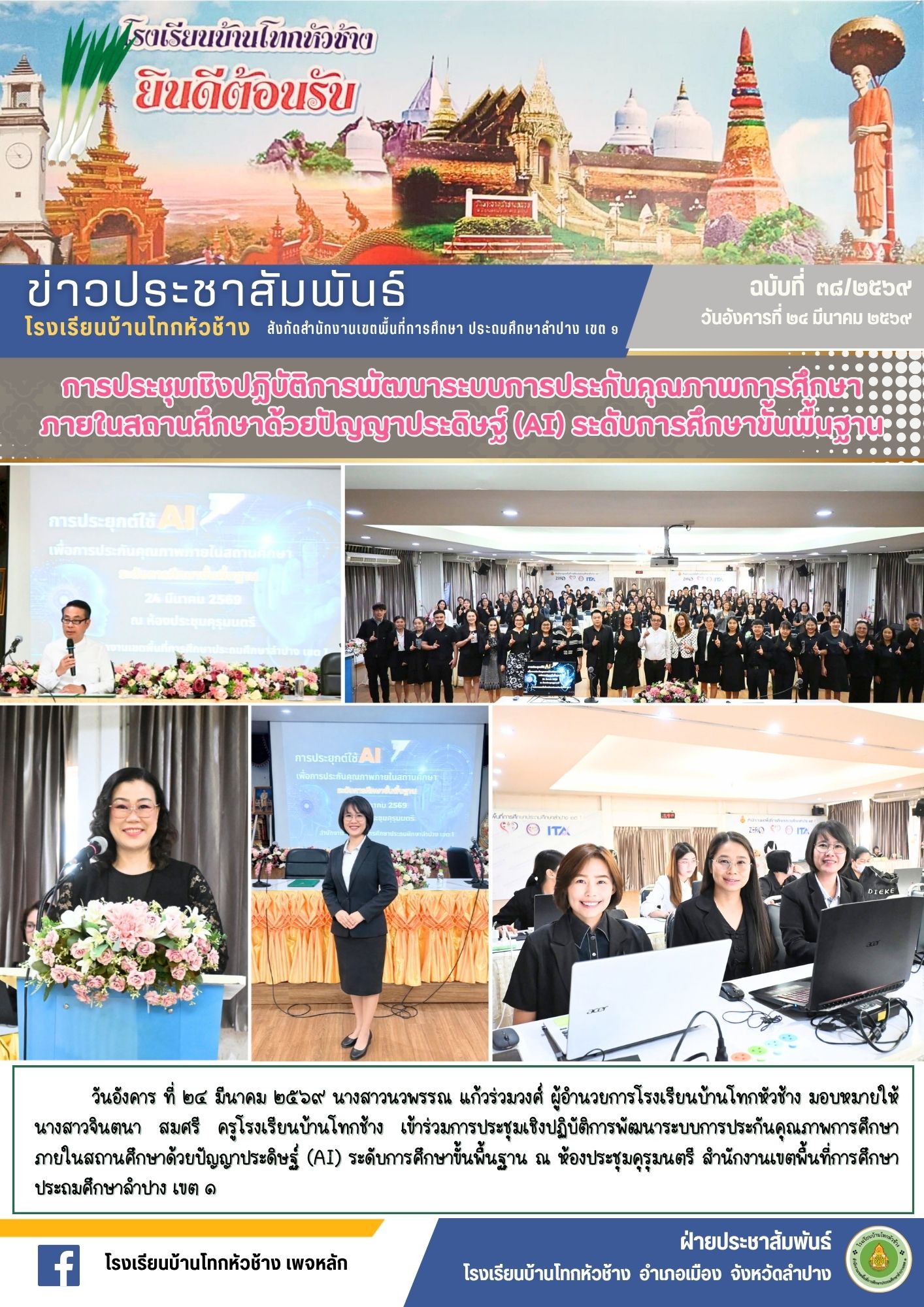 วันอังคาร ที่ ๒๔ มีนาคม ๒๕๖๙ นางสาวนวพรรณ แก้วร่วมวงศ์ ผู้อำนวยการโรงเรียนบ้านโทกหัวช้าง มอบหมายให้ นางสาวจินตนา สมศรี ครูโรงเรียนบ้านโทกช้าง เข้าร่วมการประชุมเชิงปฏิบัติการพัฒนาระบบการประกันคุณภาพการศึกษาภายในสถานศึกษาด้วยปัญญาประดิษฐ์ (AI) ระดับการศึกษาขั้นพื้นฐาน ณ ห้องประชุมคุรุมนตรี สำนักงานเขตพื้นที่การศึกษาประถมศึกษาลำปาง เขต ๑