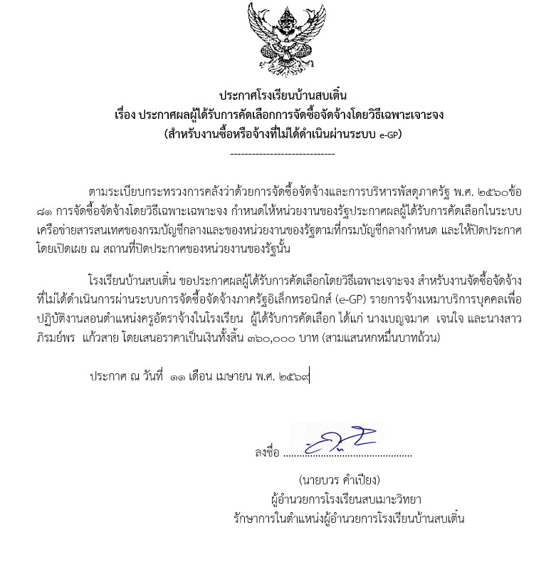 ประกาศผลผู้ได้รับการคัดเลือกการจัดซื้อจัดจ้างโดยวิธีเฉพาะเจาะจง